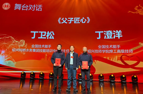 其中,全國技術(shù)能手、浙江省勞動模范、柯橋水務(wù)集團技能培訓中心常務(wù)副主任丁衛(wèi)松,以及同為全國技術(shù)能手的兒子丁澄洋同臺,通過一出舞臺對話——《父子匠心》,講述父子兩代“接力”續(xù)寫勞模工匠的勵志故事,生動的故事和真摯的情感引發(fā)了現(xiàn)場觀眾的深深共鳴。