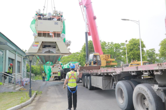 面對工期緊張、作業(yè)空間受限等挑戰(zhàn),濱海供水公司成立專班工作組,聯(lián)合設(shè)備供應(yīng)商,通過提升專家論證層級、邀請區(qū)級大型建筑行業(yè)專家優(yōu)化吊裝方案、并開展多輪現(xiàn)場踏勘,最終確定創(chuàng)新采用400噸級重型吊機,吊裝高度達(dá)21米。作業(yè)現(xiàn)場,施工團(tuán)隊精準(zhǔn)測算設(shè)備進(jìn)場路徑及吊臂旋轉(zhuǎn)半徑,實現(xiàn)單臺設(shè)備2小時快速定位,安全高效完成吊裝作業(yè)。