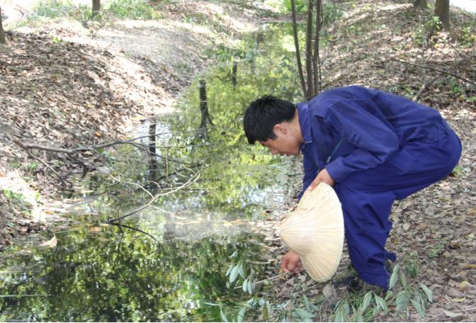 10:50,在81#標(biāo)志樁附近的小樹林里,溝里的水有些發(fā)黑,王師傅仔細(xì)查找根源,確定是旁邊的染料廢桶堆積場里流出來的廢水。