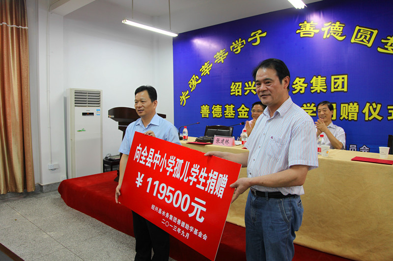 儀式上,集團倪董事長介紹了“善德基金”基本情況,并現(xiàn)場向今年受助的全縣81名中小學(xué)孤兒學(xué)生捐贈了“善德基金”助學(xué)款119500元,資助標(biāo)準(zhǔn)為小學(xué)生每人每學(xué)年1000元,初中生每人每學(xué)年1500元,高中生每人每學(xué)年2000元,并從今年開始對全縣孤兒從小學(xué)到高中讀書期間每年給予捐助。縣教體局局長蔣國洪以及縣老領(lǐng)導(dǎo)、縣關(guān)工委主任李會鵬分別作了講話,他們對集團強烈的社會責(zé)任感以及情系困難學(xué)生的善心義舉給予了高度的肯定和贊揚,希望受助學(xué)生學(xué)會堅守,學(xué)會感恩,學(xué)會奉獻,并呼吁社會各界為孩子們快樂成長、展翅高飛而共同努力。