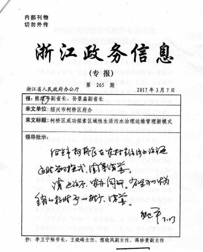 3月7日,浙江省副省長熊建平對《柯橋區(qū)成功探索區(qū)域性生活污水治理運維管理新模式》進行批示,認為柯橋區(qū)在城鄉(xiāng)生活污水治理運維管理模式值得借鑒,部分經(jīng)驗可以作為全省的標準予以推廣、借鑒。