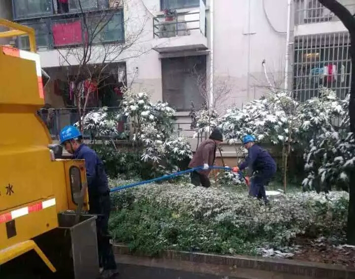 圖為管網(wǎng)養(yǎng)護員冒雪在柯橋街道紅升景園疏通生活污水管道