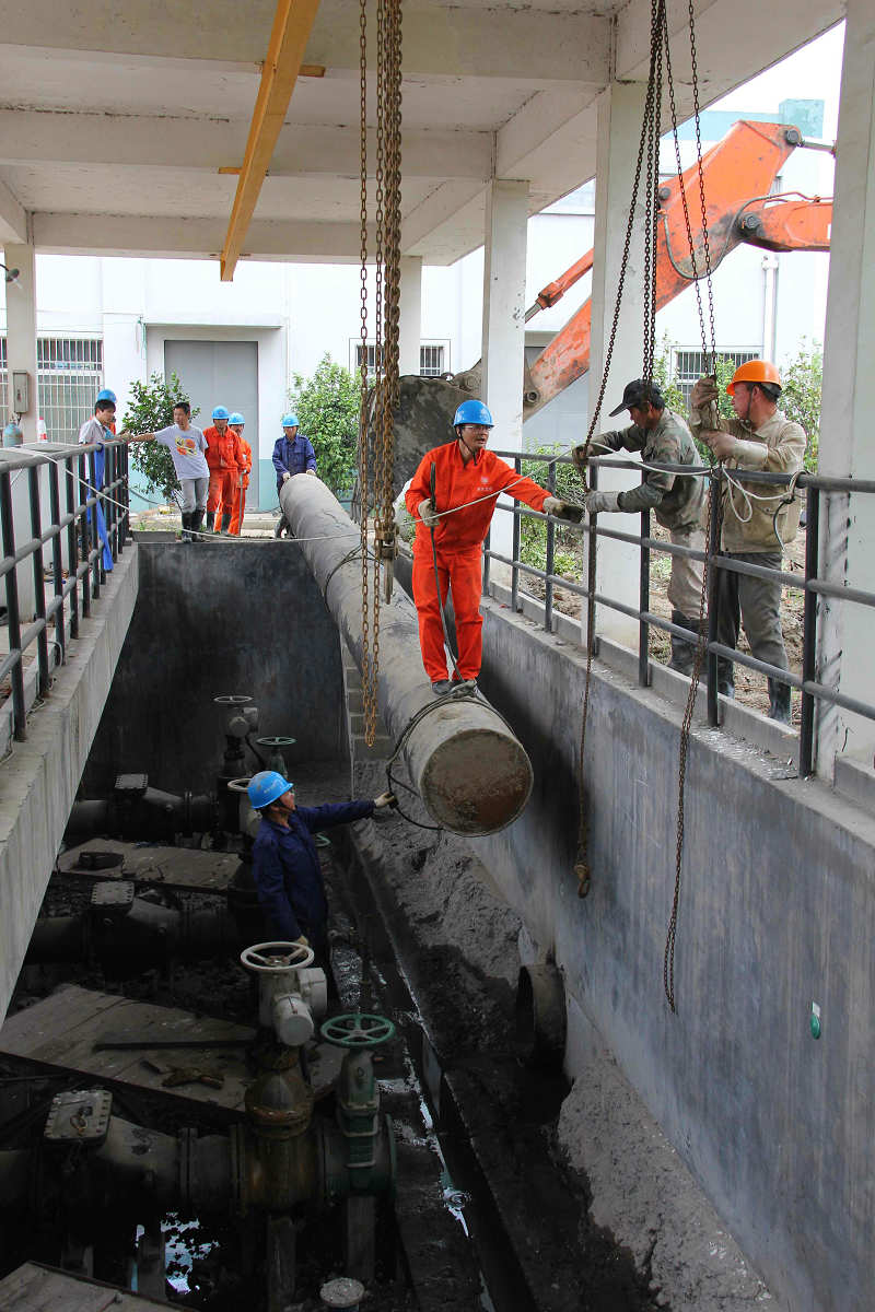 5月16日上午8:00開始,排水公司搶修人員對常年受酸性污水腐蝕的濱海北側1#泵站的80米出水總管進行突擊更換。該污水總管的更換將直接影響到周邊科瑞化工、怡中印染等22家企業(yè)的生產(chǎn),為把受影響企業(yè)的損失減少到最低程度,排水公司制訂了詳細、周密的施工方案,計劃連續(xù)施工96個小時打好這場硬仗。