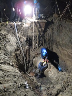 11月23日,濱海北側(cè)泵站DN500進(jìn)水管多處斷裂,導(dǎo)致濱海興濱路華納藥業(yè)門口的綠化帶上出現(xiàn)了一條長50米,寬3米深1米的溝壑,情況十分危險(xiǎn)。維修分公司立即組織人員趕赴現(xiàn)場勘察,面對(duì)路面濕滑結(jié)冰;高壓電線、水管光纜錯(cuò)綜復(fù)雜;管道破損區(qū)域廣、埋藏深度深等困難,維修員們?cè)绯鐾須w,每天工作12小時(shí),歷時(shí)17天,修復(fù)管道一百三十余米,終于在12月8日,順利完成濱海興濱路DN500管搶修工作。