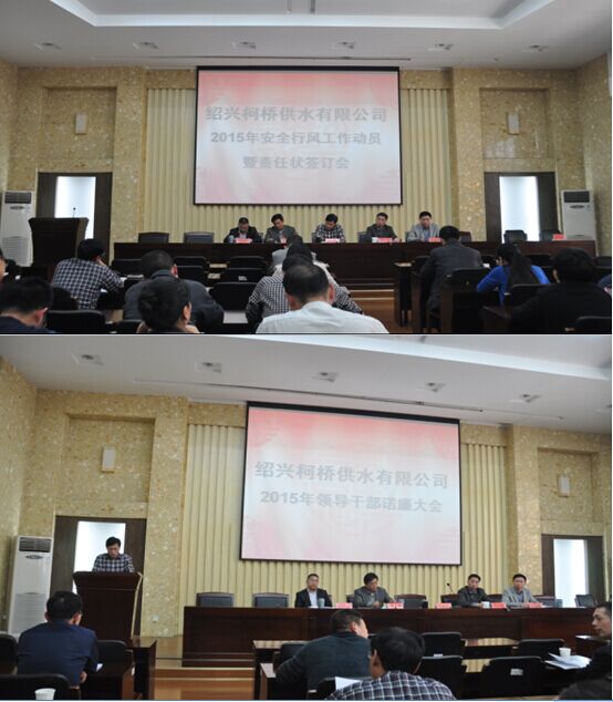 會上,公司領導班子成員及供水分公司經(jīng)理分別諾廉;安全生產(chǎn)分管副總就2015年安全、行風工作進行了動員部署;公司總經(jīng)理李葉茂與14個部門(單位)簽訂了2015年度安全、行風生產(chǎn)責任狀。