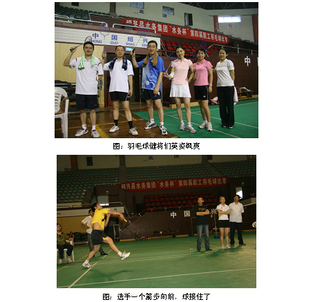 為宣揚企業(yè)文化,提倡“快樂工作、健康工作”,增進青年職工的團隊協(xié)作意識,增進同事之間的默契度,拉近跨部門業(yè)務(wù)的操作距離,2010年5月22日,水務(wù)集團團委在紹興市城東體育館舉辦了第四屆“水務(wù)杯”羽毛球比賽。