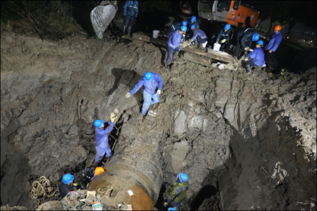 1月17日晚,紹興柯橋?yàn)I海供水公司搶修人員在寒夜中冒雨搶修D(zhuǎn)N1000一期原水管。據(jù)了解,該管線位于興濱路與越北路交叉口以南,是公司輸送原水的重要管線,公司根據(jù)工業(yè)區(qū)供水情況,在不影響企業(yè)用水的前提下展開(kāi)搶修工作,經(jīng)過(guò)開(kāi)挖、電焊等工序,連續(xù)工作12小時(shí)后,直至晚上9點(diǎn)原水管搶修完成。