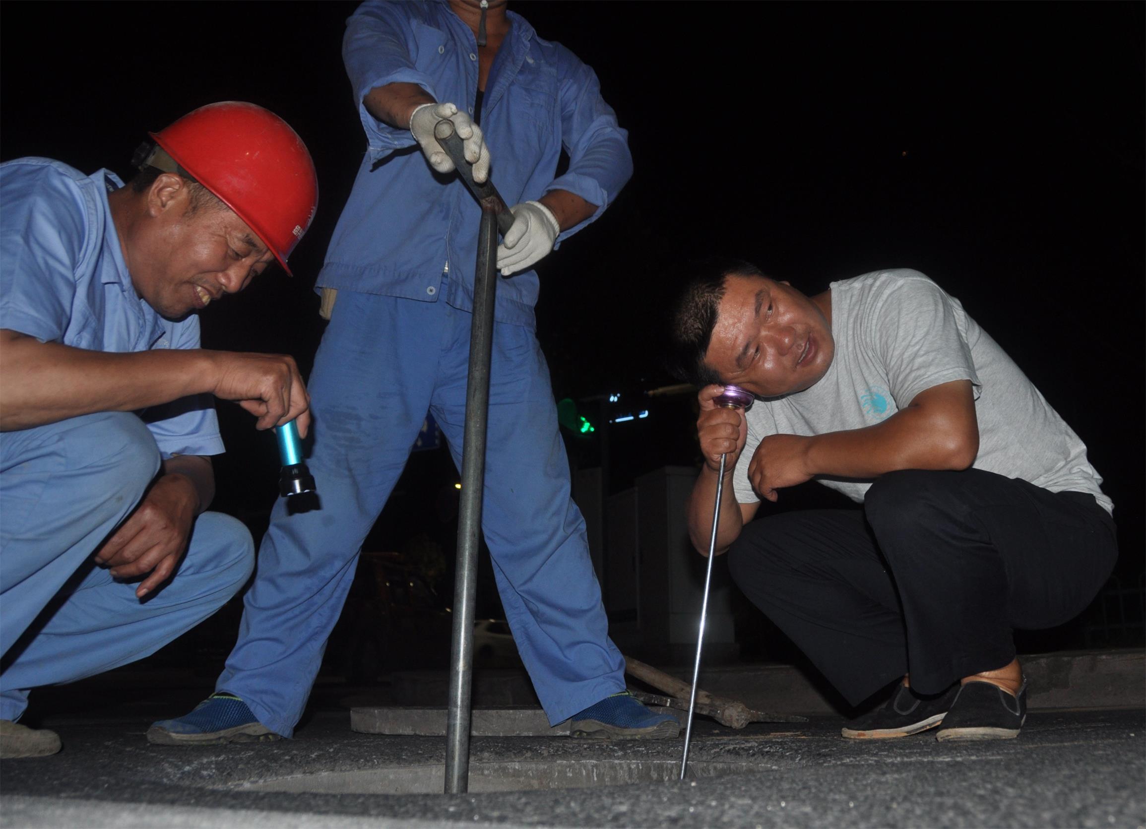 為進一步降低水量漏損,88日晚,城區(qū)分公司在前期集中“會診”的基礎(chǔ)上,協(xié)同管網(wǎng)分公司精干力量組成一支16人組成的“出診隊伍”,對柯巖南片香林大道、高爾夫路、柯巖大道和南閑路四條總管進行了夜間集中聽漏。聽診人員穿梭在夜深人靜的馬路上,用耳、用心感受“地下網(wǎng)”的疑難雜癥,發(fā)現(xiàn)可疑漏點隨即記錄筆記,并在隱患處做上標記,沒有言語交流,卻彼此配合默契。次日把“診斷報告”帶回,進行集中“會診”后再“對癥下藥”。