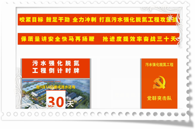 目前,在污水強(qiáng)化脫氮工程現(xiàn)場(chǎng)明顯位置,已樹立工程沖刺倒計(jì)時(shí)牌。公司要求,各級(jí)領(lǐng)導(dǎo)干部人員必須清醒認(rèn)識(shí)到形勢(shì)嚴(yán)峻,要在最后1個(gè)月的時(shí)間里拿出更大的干勁全面沖刺,確保工程建設(shè)任務(wù)的按期完成。同時(shí),公司黨支部錢書記也特別強(qiáng)調(diào),要充分發(fā)揚(yáng)黨員干部先鋒模范帶頭作用,使廣大黨員平常時(shí)候看得出來(lái)、關(guān)鍵時(shí)刻站得出來(lái)、危急關(guān)頭豁得出去,要將把黨的政治優(yōu)勢(shì)轉(zhuǎn)化為項(xiàng)目推進(jìn)優(yōu)勢(shì),把黨建力量凝聚為奮斗合力,確保工程順利建成通水。